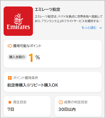 一例として、ポイントサイトのPointChipsではエミレーツ航空の案件が掲載されています。