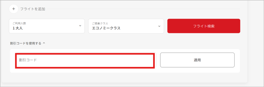 リンク先のページで目的地や日付を入力するとともに「プロモーションコード」という空欄が表示されます。ここに、学生割引であれば「STUDENT」と入力します。