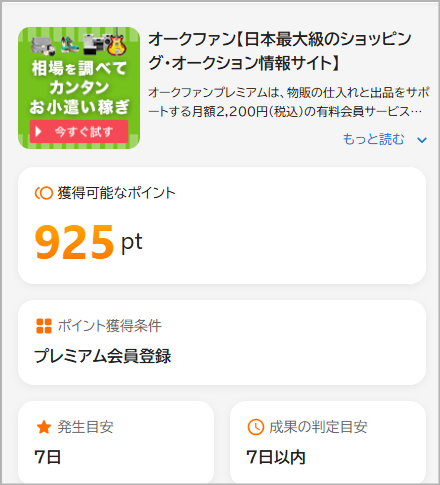 高還元な案件をいくつか完了させることで、オークファンのプレミアムプラン数ヶ月分に相当するポイントを得られます。