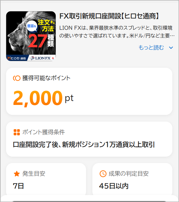 例えばPointChipsというポイントサイトでは、FX口座開設とトレード条件に応じたポイント還元が設定されています。