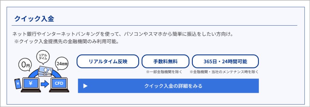 入金時にはヒロセ通商が提供する「クイック入金」を利用してください。手数料はヒロセ通商側が負担するため、ユーザー側は無料で入金できます。