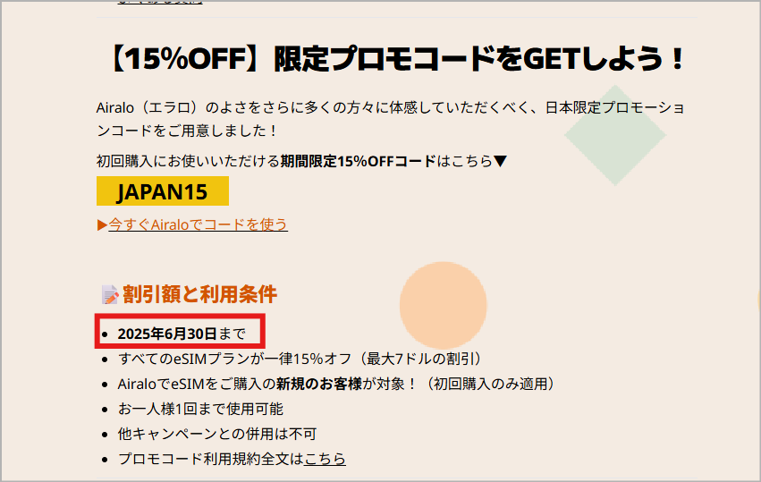 クーポン有効期間内であれば、公式が出すこの特典がおすすめです。15%OFFでAiraloのサービスを利用できます。