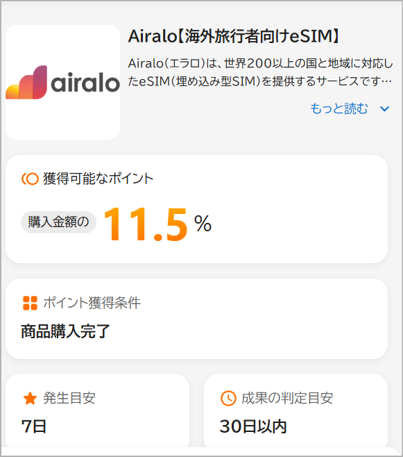 Airaloはポイントサイトを経由して申し込むと、ポイント還元を受けられます。例えばPointChipsのポイント還元率は11.5%です。