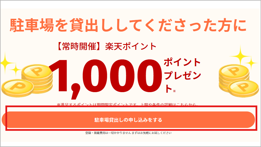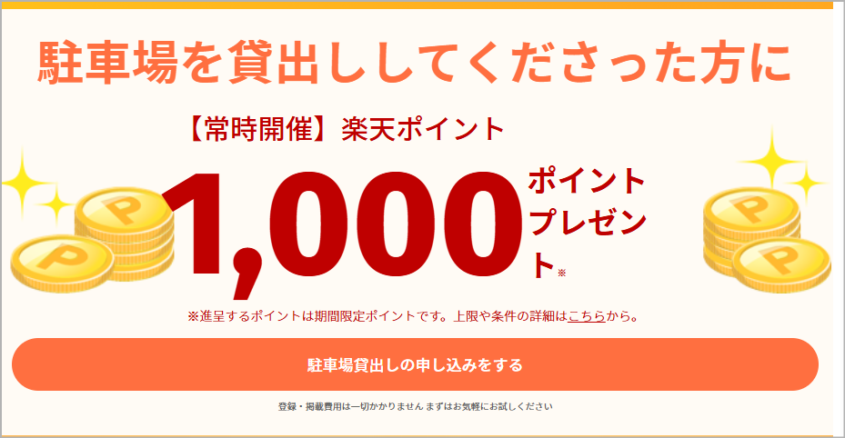 特Pに新規会員登録をして駐車場の貸出を行うと、楽天ポイント1000円分を得られます。