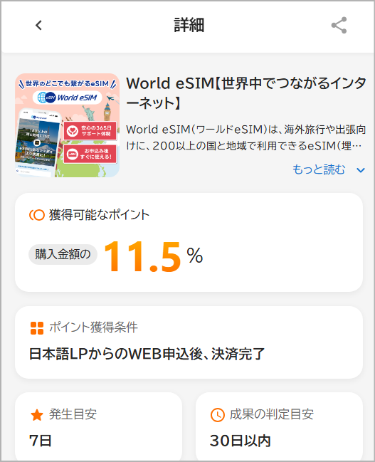 2026年4月3日時点で、PointChipsのWorld eSIM詳細ページから日本語サイトへ移動し、WEBフォームから申し込みを行って決済が完了すると、「11.5%」という高い還元を受けられます。