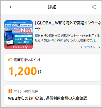 PointChipsというポイントサイトでは、GLOBAL WiFiの利用で1,200ptのポイント還元を受けられます。