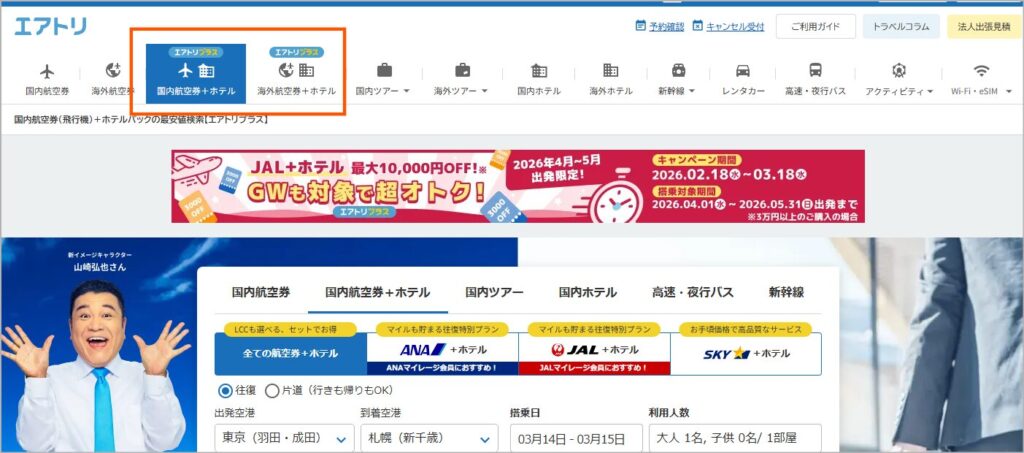 エアトリで最も割引率が高くなる予約方法は、国内・海外の航空券とホテルをセットで予約する「エアトリプラス」の利用です。