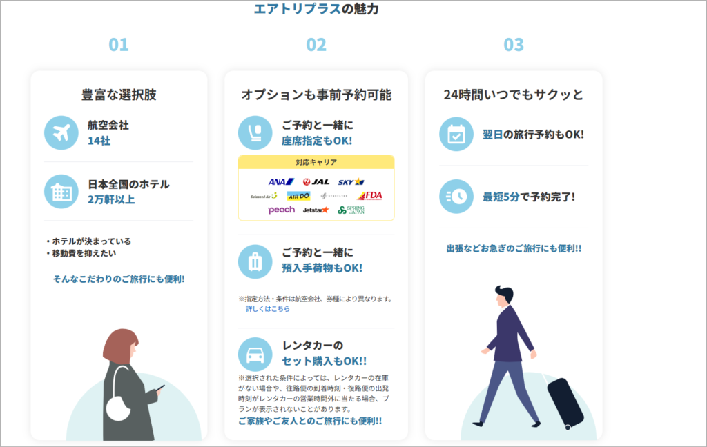 エアトリプラスは、飛行機での移動と宿泊を伴う旅行を手配する人向けの割引です。