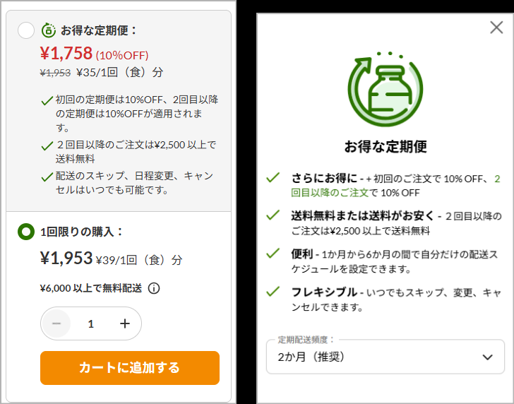 商品ページで「お得な定期便」を選択し、配送頻度を設定するだけで毎回の購入に割引が適用されます。