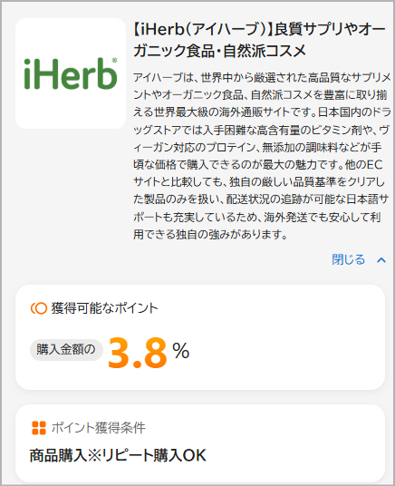 ポイントサイト経由でiHerbにアクセスして購入すると、購入金額に応じたポイントが獲得できます。