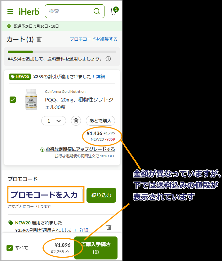 iHerbでは、購入確定前にプロモコードを入力することで割引を受けられます。
